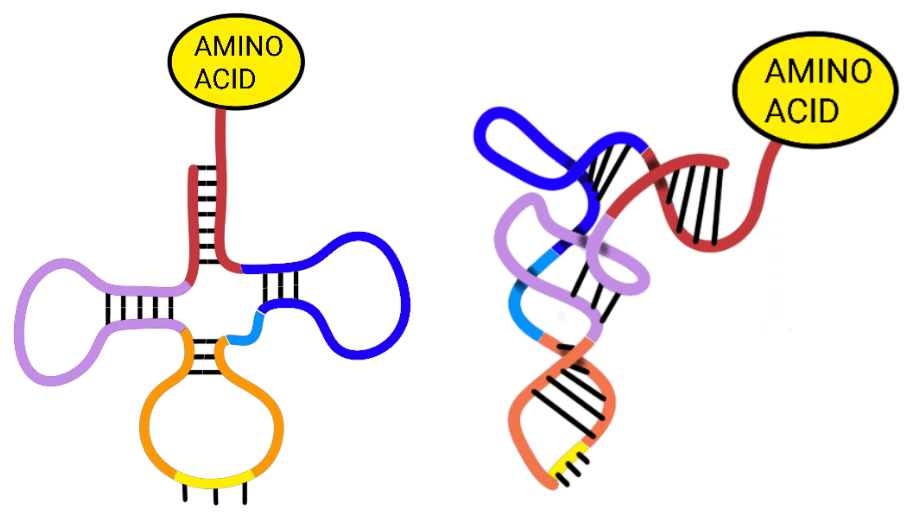 tRNA is this translator. Just like mRNA, these RNAs are coded for by genes in the genome. Instead of being translated into a protein by a ribosome, the mission of the tRNA is to loop up on itself in a very specific shape, called a cloverleaf. It is the tRNAs job to bind the mRNA, and bring along the appropriate amino acid to the ribosome.
