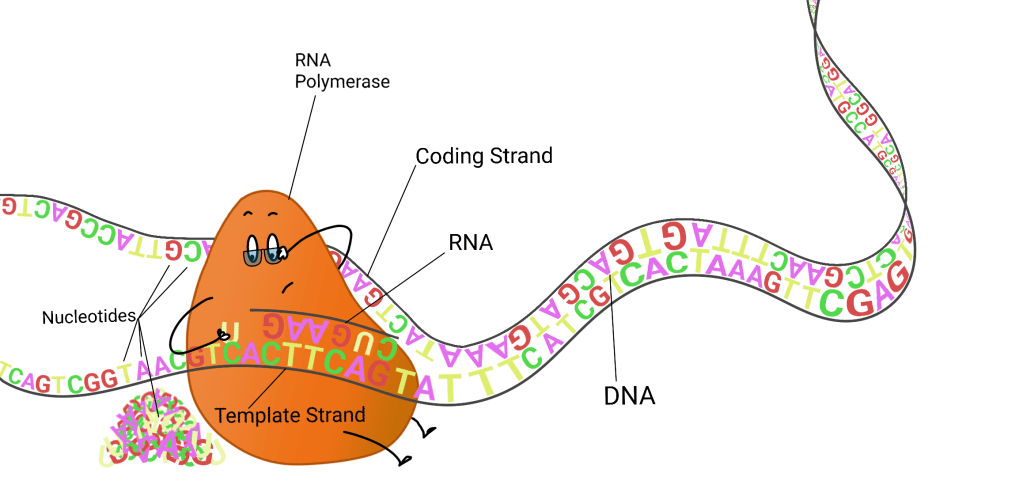 Now, what are these little protein library employees? How are they locating, reading and transcribing these four-lettered DNA tomes? As the disclaimer mentioned above, this article will leave out a few major players in this endeavor to make this toe-dip article as accessible as possible. All the ancillary characters, with cool names like promoters, enhancers, transcription factors, helicase and topoisomerase, will take the back seat for now. One hero of this story that absolutely can’t be omitted is the scribe in our analogy, RNA polymerase.